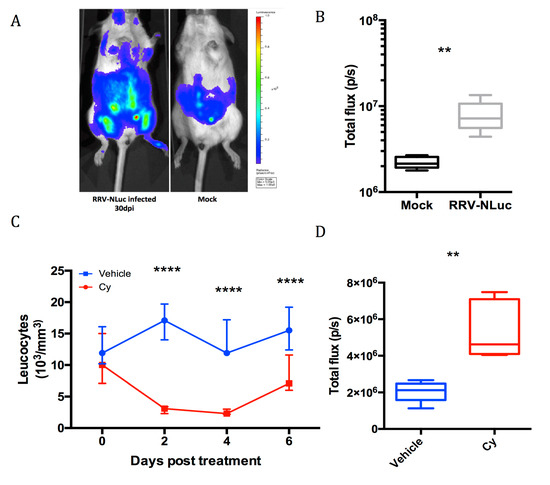 RRV chronic infection is revealed by luminescence of RRV-NLuc and cyclophosphamide immunosuppression. Groups of five mice were infected with 103 pfu RRV-NLuc and monitored for bioluminescence from 30 dpi. (A) In vivo imaging of RRV-NLuc infected (left) and mock inoculated (right) mice at 30 dpi; (B) total flux counts on the whole body of RRV-NLuc infected and mock-inoculated mice at 30 dpi. The infected group exhibits a significant bioluminescent signal (** = p < 0,01 Mann-Whitney); (C) leucocytes counts after Cy immunosuppressive (red) treatment or (blue) vehicle, median and range are represented (**** = p < 0.0001 two way ANOVA) and (D) increase in the total flux counts at 6 dpi after Cy treatment (** = p < 0.01, Mann-Whitney).