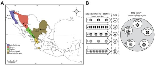 Northern-Pacific Mexico sampling areas and high-throughput sequencing (HTS) library construction. (a) Sampling areas were divided in five regions located in different biogeographic zones (according to the CONABIO classification): Baja California (BC), Sonora (SO), Sinaloa (SI), Colima-Nayarit (CN), and Coahulia-Durango (CD). BC-SQ: Baja California, San Quintin; BC-EN: Baja California, Ensenada; BC-ME: Baja California, Mexicali; SO-OB: Sonora, Obregon; SO-NA: Sonora, Navojoa; SO-HU: Sonora, Huatabampo; SO-RC: Sonora, Rio Colorado; SI-GV: Sinaloa, Guasave; SI-SL: Sinaloa, Sinaloa de Leyva; SI-MO: Sinaloa, Mocorito; SI-PC: Sinaloa, Playa Ceuta; SI-CO: Sinaloa, Concordia; SI-AC: Sinaloa, Agua Caliente; SI-RO: Sinaloa, El Rosario; CN-SO: Colima-Nayarit, Santa Maria del Oro; CN-TE: Colima-Nayarit, Tecoman; CD-TL: Coahuila-Durango, Tlahualilo; CD-LG: Coahuila-Durango, La Goma; CD-TO: Coahuila-Durango, Torreon; CD-PO: Coahuila-Durango, Poanas. Sampling areas are indicated in the map by colored squares. (b) Diagram of sample processing to obtain HTS libraries. For each sampling area, total DNA from Begomovirus PCR-positive plants belonging to the same species was pooled in equimolar concentrations. The resulting DNA mix was used as a template for rolling circle amplification (RCA)-mediated viral circular molecule enrichment. Finally, all resulting RCA products were pooled in equimolar concentrations and used for HTS library construction.