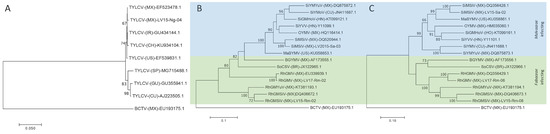 Phylogenetic trees based on multiple sequence alignment of complete monopartite (A) and bipartite begomovirus DNA-A (B), and DNA-B (C) with selected isolates obtained from NCBI. Trees were constructed by the maximum likelihood method with 1000 bootstrap replicates using MEGA7. Virus acronyms: Bean golden yellow mosaic virus (BGYMV), Malvastrum bright yellow mosaic virus (MaBYMV), Okra yellow mosaic virus (OYMV), Rhynchosia golden mosaic Sinaloa virus (RhGMSV), Rhynchosia golden mosaic virus (RhGMV), Rhynchosia golden mosaic Yucatan virus (RhGMYuV), Sida golden mosaic Honduras virus (SiGMHoV), Sida mosaic Sinaloa virus (SiMSiV), Sida yellow mottle virus (SiYMV), Sida yellow mosaic Yucatan virus (SiYMYuV), Sida yellow vein virus (SiYVV), Soybean chlorotic spot virus (SoCSV). Viral genomes Accession numbers are shown. Countries codes are as follow: Brazil (BR), Cuba (CU), Guatemala (GU), Ecuador (EC), Honduras (HN), Israel (IR), Mexico (MX), Puerto Rico (PR) and United States of America (US). As an out-group, Beet curly top virus sequence (BCTV) was used. Malvaceae and Fabaceae infecting virus are highlighted in blue and green, respectively.