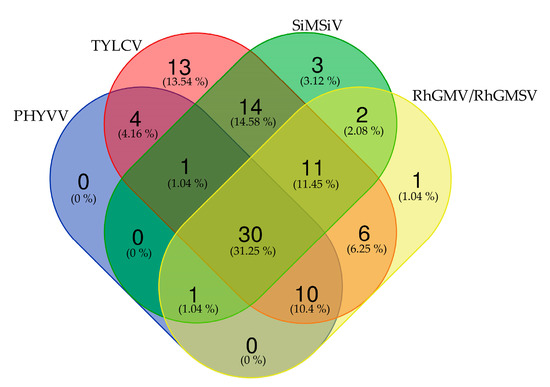 Venn diagram of predominant begomovirus detected. A total of 126 individual species were examined for the presence of predominant begomovirus in the five sampling regions. The number of begomovirus-positive plants (97) showing single, double, triple or quadruple infections is reported. The values are also reported in percentage in parenthesis. Virus acronyms: Pepper huasteco yellow vein virus (PHYVV), Rhynchosia golden mosaic virus, (RhGMV), Rhynchosia golden mosaic Sinaloa virus (RhGMSV), Sida mosaic Sinaloa virus (SiMSiV), Tomato yellow leaf curl virus (TYLCV).