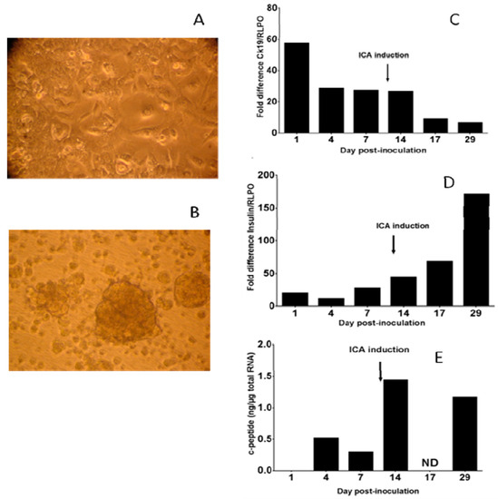 Human primary pancreatic ductal cells. Ductal cell cultures (A) were exposed to trypsin and serum-free medium to induce the formation of islets-like cell aggregates (ICAs) (B) (magnification: 40×). The levels of CK19 and insulin mRNA were monitored by quantitative PCR throughout the culture (C and D). The levels of c-peptide in supernatants were determined by ELISA, the results were expressed as ng of c-peptide per µg of total RNA (E) (ND: not done). The representative results of two independent experiments are shown.