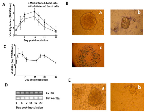 Human primary ductal cells were seeded in 24-well plates and infected with 2.103 TCID50 (Median Tissue Culture Infective Dose) CV-B4 E2 on day 21 post-isolation. Plates were incubated at 37 °C in a humidified atmosphere with 5% CO2 for 3 h then the cell layers were washed three times with cold culture medium. After washing, ductal cell cultures were maintained in fresh DMEM at 37 °C in an incubator and supernatant samples were harvested 3 h post-inoculation (i.e., day one p.i.).