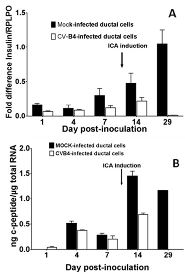 CV-B4 E2 can inhibit the production of insulin by human primary pancreatic ductal cells. Ductal cell cultures were mock-infected or infected with CV-B4 E2, and followed by transformation on day 14 post-inoculation. (A) insulin mRNA expression was quantified by RT-qPCR and normalized with RLPO expression. (B) C-peptide levels in supernatants were assessed by ELISA, and normalized with total RNA harvested from cells. Results are mean +/- SD of two independent experiments.