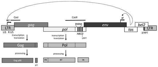 FVs are complex retroviruses, i.e., they contain accessory genes. Similar to orthoretroviruses, their genomes contain the genes gag, pol, and env (Figure 1). However, in contrast to orthoretroviruses such as human immunodeficiency virus (HIV), the Pol protein is expressed from a separate mRNA and translated from its own AUG start codon; thus, no Gag–Pol fusion protein is produced [,,].