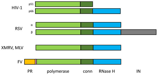 Conventional retroviruses express pol as a Gag–Pol fusion protein by a rare frameshift event or nonsense codon suppression mechanism. In FVs, Pol is generated from a spliced mRNA independently from Gag [,,,,,]. It contains the genes for the PR, polymerase, and RNase H domains, forming the reverse transcriptase (RT) as well as the integrase domain (IN) (Figure 1). The FV Pol protein undergoes only limited proteolysis. A single cleavage between the RNase H and IN domains is carried out, resulting in two mature viral enzymes IN and a PR–RT fusion protein [,]. This is in contrast to HIV and other orthoretroviruses, in which Pol is cleaved by the viral PR into three separate proteins, PR, RT and IN (reviewed in []).
