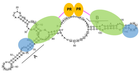 Model of protease (PR) activation upon binding to the PR-activating RNA motif (PARM). Both the A and B elements are required. They are involved in stem structures to which two PR-RT molecules can bind. Upon interaction of the RT domain with the RNA, the PR domains of the two PR-RTs can dimerize. Colors as in Figure 2.