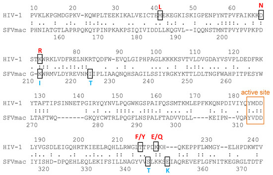 Sequence alignment of the regions of human immunodeficiency virus (HIV)-1 and SFVmac RT, showing the azido-3′deoxythymidine (AZT) resistance amino acid exchanges. The amino acids conferring AZT resistance are shown in red for HIV-1 (M41L, D67N, K70R, T215Y/F, K219E/Q) and blue for SFVmac RT (K211I, I224T, S345T, E350K), respectively. The amino acids of the polymerase active site are highlighted by an orange box. The amino acid identity is 26.2%.