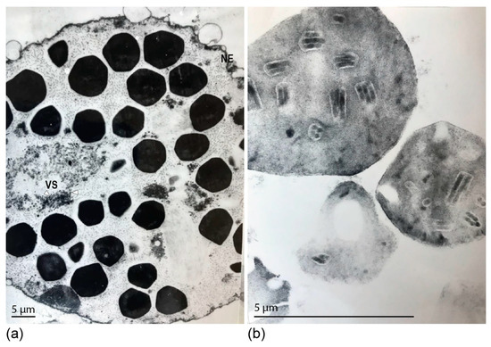 Ultrastructural analysis of the Dione juno nucleopolyhedrovirus (DijuNPV) occlusion bodies (OBs). (a) Passionfruit caterpillars were fed on contaminated passionfruit leaves, and when the first symptoms of infection appeared, the insects were frozen and dissected for fat body extraction. The tissue was fixed and prepared for transmission electron microscopy. A section of a single cell inset on the nucleus is presented here. The nuclear envelope (NE) surrounds several polyhedral OBs. The virogenic stroma (VS) presents non-enveloped rod-shaped nucleocapsids (white arrowhead). (b) Cross section of a purified DijuNPV OB showing several occlusion-derived viruses containing multiple nucleocapsids.