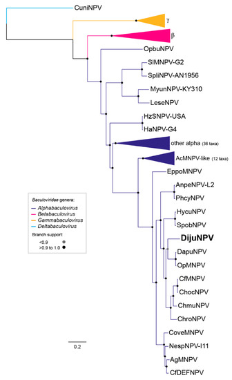 3.5. DijuNPV May be a Representative of a Novel Species Inside Genus Alphabaculovirus