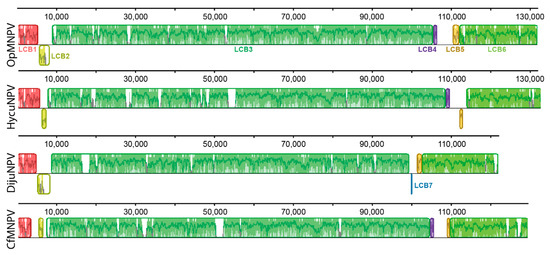 Genome comparison of DijuNPV and its related viruses. DijuNPV is compared to three alphabaculovirus genomes, including Hyphantria cunea nucleopolyhedrovirus (HycuNPV), Orgyia pseudotsugata multiple nucleopolyhedrovirus (OpMNPV), and Choristoneura fumiferana multiple nucleopolyhedrovirus (CfMNPV). The same colors depict the same LCBs across the genomes. Seven Locally Collinear Blocks (LCB) numbered from 1 to 7 were found. The DijuNPV genome lost LCB4 (purple) and present LCB7 (blue) instead. The white regions depict sequence loss.