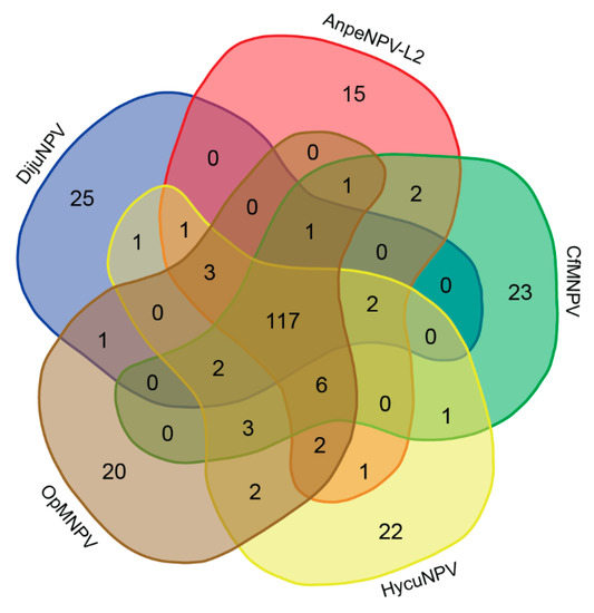 Venn diagram comparing the gene content among DijuNPV and some selected relatives. Total number of genes of the five alphabaculovirus (DijuNPV, AnpeNPV-L2, CfMNPV, OpMNPV, and HycuNPV) were compared by BLASTX to find homologies among the genes of the different genomes. A total of 251 genes were found, 25 were present only in the DijuNPV genome (eight are found in other baculovirus, and 17 are unique to DijuNPV); 117 are shared between the five viruses and only one single gene is found between DijuNPV and OpMNPV, the tmk homolog, which in the OpMNPV genome is found fused to the dut.