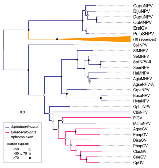 - Jehle, J.A.; Lange, M.; Wang, H.; Hu, Z.; Wang, Y.; Hauschild, R. Molecular identification and phylogenetic analysis of baculoviruses from Lepidoptera. Virology 2006, 346, 180–193. [Google Scholar] [CrossRef] [PubMed]
