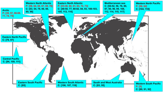 Locations of reported phocine distemper virus infections of pinnipeds and cetacean morbillivirus infections of cetaceans. Numbers indicate references. P (red), pinnipeds; C (black), cetaceans.