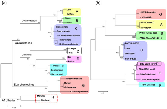 Phylogenetic trees of full-length signaling lymphocyte activation molecules (SLAMs) (a) and full-length morbillivirus hemagglutinin (H) proteins (b). Neighbor-joining methods were implemented in MEGA7 [142,143]. The bootstrap probabilities with 500 replications are shown at the nodes. Respective pairs of host animals and corresponding morbilliviruses are shown as squares with the same color and same alphabetic notations: A, large ruminants; B, small ruminants; C, cetaceans; D, felids; E, canids; F, pinnipeds; G, primates. Morbilliviruses have not been identified in manatees and elephants (H, red dashed box). The amino acid sequences of full-length SLAMs were obtained from the Data Bank of Japan: cow (Bos taurus, AAK61860.1); buffalo (Bubalus bubalis, ABB58751.1); sheep (Ovis aries, NP_001035378.1); goat (Capra hircus, ABB58752.1); minke whale (Balaenoptera acutorostrata, XP_007171815.1); sperm whale (Physeter catodon, XP_007124119.2); Pacific white-sided dolphin (Lagenorhynchus obliquidens, BAH10670.1); killer whale (Orcinus orca, BAH1067.1); bottlenose dolphin (Tursiops truncatus, XP_004327894.1), tiger (Panthera tigris altaica, XP_007092436.1); cat (Felis catus, BAN42597.1); dog (Canis lupus familiaris, AAK61857.1); red fox (Vulpes vulpes, ACD47119.1); walrus (Odobenus rosmarus, BAH10673.1); spotted seal (Phoca largha, BAH10672.1); harbor seal (Phoca vitulina, AYR16904.1); rhesus monkey (Macaca mulatta, XP_001117605.1); human beings (Homo sapiens, NP_003028.1); chimpanzee (Pan troglodytes, XP_513924.2); cotton-top tamarin (Saguinus oedipus, AAG02017.1); manatee (Trichechus manatus, BAH10674.1); and elephant (Loxodonta africana, XP_003415237.1). The amino acid sequences of morbillivirus full-length H proteins were obtained as follows: MV Edmonston AIK-C strain (BAB60866.1); MV 9301B strain (BAA33872.1); RPV Kabete O strain (AAA47401.1); RPV RBOK strain (CAA83182.1); PPRV Turkey 2000 strain (YP_133827.2); PPRV Ghana/NK1/2010 strain (AID07002.1); DMV Bph/2013 strain (AOZ56997.1); DMV (NP_945029.1); PMV 2990 strain (AAT84062.1); PMV IRL/88 strain (ACV50419.1); CDV Lion94SNP strain (AFQ38775.1); CDV 5804/Han90 strain (CAA59359.1); CDV Baikal seal strain (CAA59357.1); CDV Onderstepoort vaccine strain (AAG30920.1); and PDV Ulster/88 strain (BAA01207.1). Each amino acid sequence alignment was generated using ClustalW version 1.8.