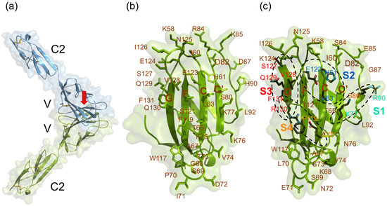 Ribbon representation of the three-dimensional (3D) structures of signaling lymphocyte activation molecules (SLAMs) from killer whales (Orcinus orca) and cotton-top tamarins (Saguinus oedipus). The 3D models were constructed by homology modeling based on the crystal structure of the complex between MV-H and the cotton-top tamarin SLAM-V [148,150]. (a) Blue and green models show the two SLAM extracellular domains of killer whales forming a homophilic dimer. β-strands are indicated by blue and green arrows and disulfide bonds are shown as yellow lines. The red arrow indicates the direction of view of the interface for morbillivirus binding as shown in (b) and (c). (b) Interface of the killer whale SLAM from the view of the red arrow in (a). Four β-strands are indicated as C, C’, F, and G. The amino acids that potentially interact with the viral H protein are shown along with their position numbers. The amino acid positions correspond to those of the MV-H–SLAM-V crystal structure [148]. (c) As a reference, the cotton-top tamarin SLAM interface is shown. The four binding sites (S1–S4) present in the crystal structure [148] are marked with dotted circles. The residues involved in these four binding sites are colored differently (site 1—mint green; site 2—cyan; site 3—red; site 4—orange) with colored atoms (black for carbon, blue for nitrogen, and red for oxygen). This figure was modified from Shimizu et al. [150].