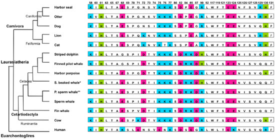 Alignment of the 35-residue signaling lymphocyte activation molecule (SLAM) subsequence important for interaction with the hemagglutinin (H) protein along with the corresponding phylogenetic tree. The mammalian phylogenetic tree was created by merging a conventional mammalian tree [140,141], the detailed cetacean tree generated using the short interspersed elements method [159,160,161], and the detailed tree of Caniformia generated using maximum likelihoods method [162]. Cyan, green, and pink boxes, respectively, indicate positively, weak-positively, and negatively charged amino acids. * Stejneger’s beaked whale, ** Pygmy sperm whale.