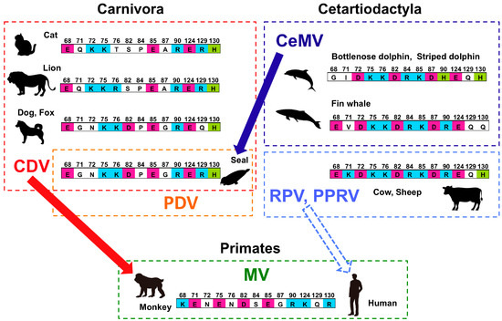 Schematic diagram of the relationships between morbillivirus species and their host animals. The hosts of each morbillivirus species are surrounded by dotted squares. The names of the various morbilliviruses are given in different colors. Residues of the 35-residue signaling lymphocyte activation molecule (SLAM) subsequence involved in hemagglutinin (H) protein binding that are not conserved among the host animal species are shown. Conserved residues or conservative amino acid substitutions are not shown. Thick colored arrows indicate recent host expansion beyond the order, and the dotted arrow indicates that the inferred transmission event during the evolution of MV.