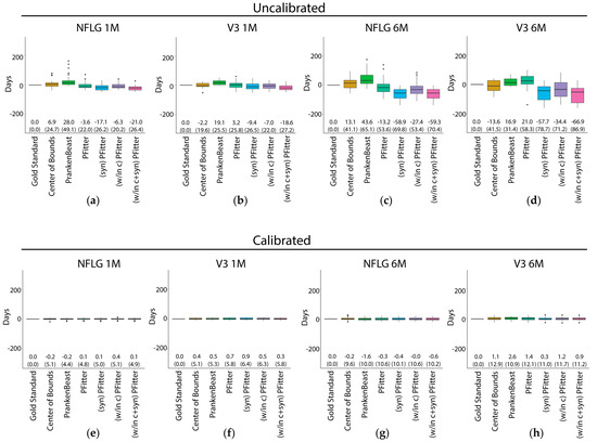 Prediction errors of the Center of Bounds, PrankenBeast, Poisson Fitter, and modified Poisson Fitter estimators of infection time before (a–d) and after (e–h) calibration for mutation rate after fitting a linear model with terms for log10 plasma viral load (lPVL), the interaction of the estimator with lPVL, the last negative date, the interaction of the estimator with the last negative date and an intercept. Predictions were made on held out data in a leave-on-out cross-validation scheme (see Methods). The sequences used for prediction were: (a), (e): RV217 (NFLG) 1-2 months; (b), (f): CAPRISA 002 (V3) 1-2 months; (c), (g): RV217 ~6 months; (d), (h): CAPRISA 002 ~6 months. The median difference between the predicted and gold-standard values is shown as the center line of each box; the solid box boundaries illustrate the 25th and 75th percentiles (interquartile range, IQR). The leftmost entry (“Gold standard”) depicts the (zero) “prediction” error if the true days since infection values are known. Values depicted in parentheses indicate the root mean squared error, which is an estimate of the standard error when the fitted predictor is applied to future samples, and the bias is shown above these. The whiskers extend to the most extreme data point within 1.5 times the IQR from the box boundaries; points outside of this range are plotted as outlier points. NFLG, near full-length genome.