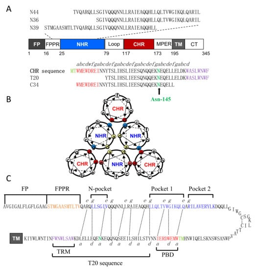 A substantial body of evidence supports that the interactions between the NHR and CHR helices essentially determine the functionality of viral 6-HB structure [,,,,,,]. Structurally, the coiled-coil domains HIV-1 gp41 share a characteristic heptad repeat sequence, usually denoted as (abcdefg)n, with hydrophobic residues at the first (a) and fourth (d) positions. In a helical wheel model (Figure 1), the inner NHR homotrimer is packed against each other through the interactions of residues at the “a” and “d” sites, whereas its residues at the “e” and “g” sites lie on the outside of the central coiled-coil to make extensive contacts with the residues at the “a”, “d”, and “e” sites of the CHR helices. Prominently, the residues at the “b”, “c”, and “f” sites on both the NHR and CHR helices are located away from the interaction center. In terms of the sequence, the gp41 CHR can be further divided into an N-terminal pocket-binding domain (PBD), a middle NHR-binding domain (NBD), and a C-terminal tryptophan-rich motif (TRM). Crystal structures of the 6-HBs reveal that three hydrophobic residues from the PBD (Ile-117, Trp-120, and Trp-124) penetrate a deep pocket on the C-terminal portion of the NHR trimer, which critically stabilizes the NHR-CHR interactions [,,,,].