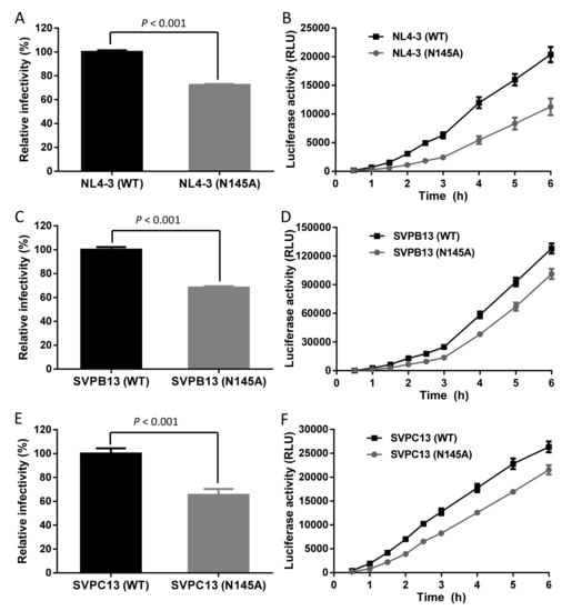 In order to define the function of Asn-145 for HIV-1 infectivity, we firstly generated a mutant Env bearing N145A mutation with a plasmid encoding the X4-tropic virus HIV-1NL4-3 Env (clade B) as a template. After the site-directed point mutation was verified by DNA sequencing, both the wild-type (WT) and mutant Env-pseudotyped viruses were generated and their infectivity in TZM-bl cells was compared by a single-cycle infection assay. As shown in Figure 2A, the N145A mutant virus exhibited significantly decreased cell entry efficiency relative to the WT virus. Then we measured the kinetics of Env-mediated cell-cell fusion by a dual split-protein (DSP)-based fusion assay. As shown in Figure 2B, the fusogenic ability of the N145A Env also decreased markedly. To verify the results, we further introduced the N145A mutation into two R5-tropic Envs derived from HIV-1SVPB13 (clade B) and HIV-1SVPC13 (clade C). Consistently, both the mutant Envs displayed significantly reduced activities to mediate pseudovirus entry and cell-cell fusion (Figure 2C–F). Therefore, the conserved residue Asn-145 plays critical roles for HIV-1 Env-mediated cell fusion and infection.