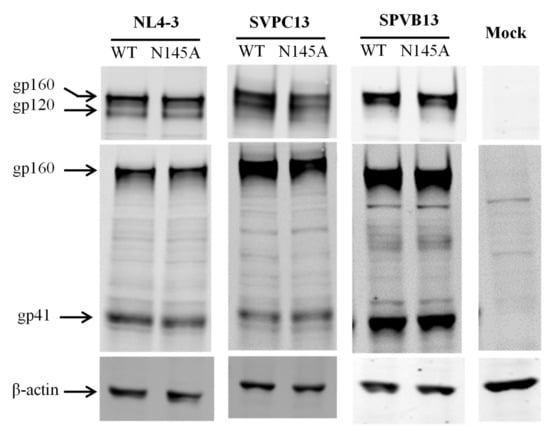 Effects of the N145A mutation on the expression of HIV-1 Env glycoprotein determined by Western blotting. The viral Env glycoproteins in the lysates of transfected cells were detected with a rabbit anti-gp120 polyclonal antibody (upper panel) and the human anti-gp41 monoclonal antibody 10E8 (middle panel). The reaction bands corresponding to gp160, gp120, and gp41 are marked. The experiments were repeated three times, and representative data are shown.