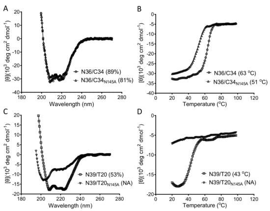 Effects of the N145A mutation on the secondary structure and thermostability of 6-HB. The α-helicity (A) and thermostability (B) of the native and mutant C34 in complexes with N36 and the α-helicity (C) and thermostability (D) of the native and mutant T20 in complexes with N39 were respectively determined by circular dichroism (CD) spectroscopy. The final concentration of each peptide was 10 μM in PBS. The experiments were repeated two times, and representative data are shown.