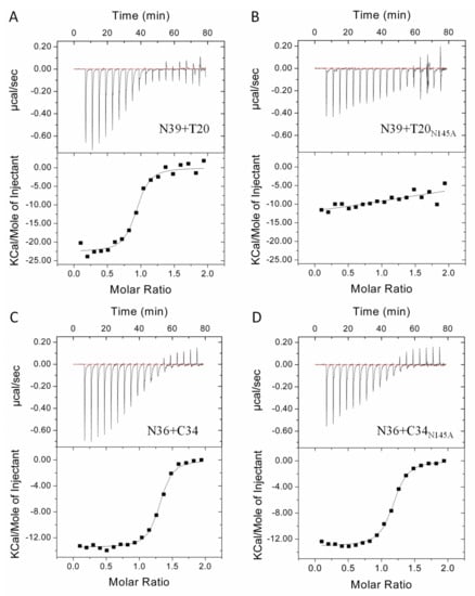 Considering that the CD spectroscopy measured the secondary structure and thermostability of a preformed peptide complex rather than their instantaneous interactions, we next applied isothermal titration calorimetry (ITC) to determine the thermodynamic parameters of the peptide pairs in a real-time molecular interaction, including the binding constant (K), reaction stoichiometric (N), enthalpy (ΔH), and entropy (ΔS). As shown in Figure 5 and Table 1, the interactions of all the four peptide pairs were a typical enthalpy-driven reaction, in which large amounts of heat were released. Although the N39/T20 complex had much less α-helicity and thermostability than the N36/C34 complex determined by CD spectroscopy, they exhibited comparable binding affinities with the K values of 3.2 ×106 M-1 and 3.3 × 106 M−1, respectively (Figure 5A,C), which verified that non-helical interactions might dominate the interactions between N39 and T20. Surprisingly, the N39 and T20 interaction could be severely impaired by the N145A substitution, resulting in an unstable reaction profile in which thermodynamic parameters could not be precisely defined (Figure 5B); by contrast, C34N145A largely retained its interaction affinity with N36 with a K value of 2.2 × 106 M−1. Taken all the biophysical data together, we conclude that the polar Asn-145 residue plays critical roles in the interaction of the NHR and CHR helices of gp41.