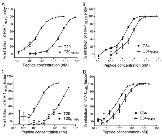 Both T20 and C34 are CHR-derived native peptides with potent anti-HIV activity. Herein, we focused on determining whether the N145A substitution affected the inhibitory activities of T20 and C34. In the single-cycle infection assay, T20 and T20N145A inhibited HIV-1NL4-3 pseudovirus entry in TZM-bl cells with IC50 values of 4.2 ± 0.5 and 291.5 ± 26 nM, respectively, which indicated a 69.4-fold reduction for the inhibitory activity of T20N145A (Figure 6A); C34 and C34N145A inhibited HIV-1NL4-3 pseudovirus with IC50 of 1 ± 0.1 and 4.8 ± 0.7 nM, respectively, indicating a 4.8-fold reduction for the inhibitory activity of C34N145A (Figure 6B). In the cell-cell fusion assay, T20 and T20N145A inhibited HIV-1HXB2 Env-mediated cell fusion with IC50 of 4 ± 0.7 and 304.1 ± 58.6 nM, respectively, which indicated a 76-fold difference (Figure 6C); C34 and C34N145A inhibited HIV-1HXB2 with IC50 of 0.6 ± 0.1 and 2.2 ± 0.5 nM, respectively, indicating a 4-fold difference (Figure 6D). Therefore, Asn-145 is also an important residue for the antiviral activity of CHR-based fusion inhibitor peptides.