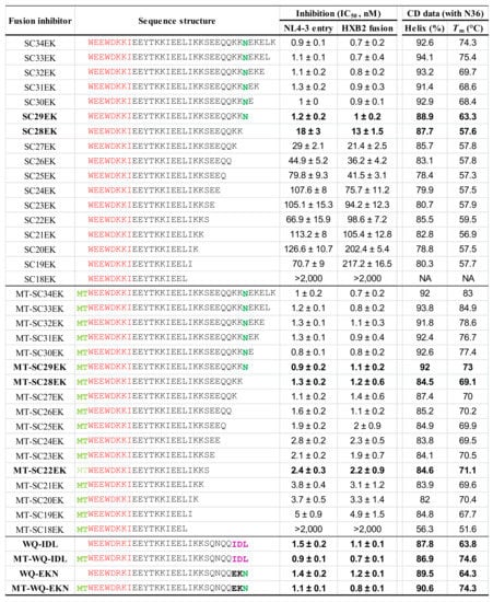 - Ding, X.; Zhang, X.; Chong, H.; Zhu, Y.; Wei, H.; Wu, X.; He, J.; Wang, X.; He, Y. Enfuvirtide (t20)-based lipopeptide is a potent HIV-1 cell fusion inhibitor: Implication for viral entry and inhibition. J. Virol. 2017, 91, e00817–e00831. [Google Scholar] [CrossRef] [PubMed]