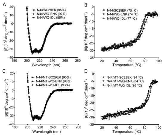 The α-helicity and binding stability of the inhibitors with a C-terminal Asn-145 or IDL anchor. The α-helical contents (A) and thermostabilities (B) of SC29EK, SC29-ENK, and WQ-IDL in the presence of the NHR-derived target mimic peptide N44 and the α-helical contents (C) and thermostabilities (D) of the M-T hook-modified inhibitors MT-SC29EK, MT-SC29-ENK, and MT-WQ-IDL in the presence of N44 were respectively determined by circular dichroism (CD) spectroscopy. The final concentration of each peptide was 10 μM in PBS. The experiments were repeated two times, and representative data are shown.