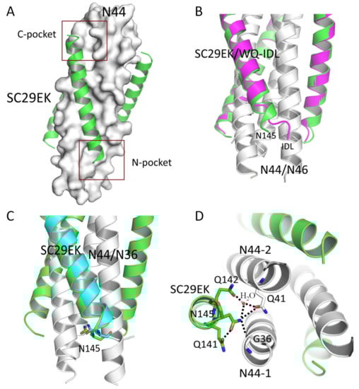 Structural basis of Asn-145-mediated binding network in SC29EK inhibitor. (A) The 6-HB structure of the SC29EK/N44 complex. The N44 trimer is shown in surface and colored in gray, with the C-terminal deep pocket (C-pocket) and the N-terminal shallow pocket marked; SC29EK inhibitors are shown in ribbon and colored in green. (B) Superimposing of the SC29EK/N44 structure with the WQ-IDL/N46 structure (PDB accession number 5H0N). SC29EK inhibitors are in green with a marked Asn-145 residue, WQ-IDL inhibitors are in magenta with a marked IDL anchor. (C) Superimposing of the SC29EK/N44 structure with the SC29EK/N36 structure (PDB accession number 5Z0W). SC29EK in the SC29EK/N44 is marked in green and SC29EK in the SC29EK/N36 is in cyan. (D) Stick model of Asn-145-mediated interhelical and intrahelical interactions. Dashed lines indicate the hydrogen bonds.