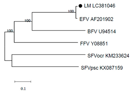 Phylogenetic analysis of the Japanese isolate EFVeca_LM (LM LC301046) and other foamy virus strains. The phylogenetic tree was generated using complete nucleotide genome sequences. EFVeca_LM is indicated by a closed circle. Bootstrap values less than 50% are not shown on the corresponding nodes. BFV: bovine foamy virus, FFV: feline foamy virus, SFVocr: simian foamy virus Otolemur crassicaudatus, SFVpsc: simian foamy virus Pan troglodytes schweinfurthii.