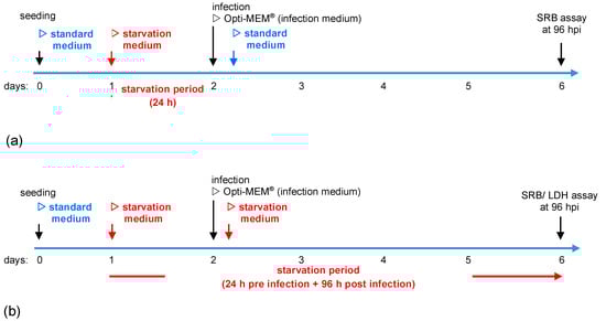 Illustration of starvation conditions. (a) Short-term starvation: Cells were seeded in standard medium. On day 1, medium was changed to starvation medium (i.e., starvation medium with variations in contents of glucose and fetal calf serum (FCS)). On day 2, infection with MeV was performed in infection medium (Opti-MEM®). At 3 h post-infection (hpi), infection medium was replaced with standard medium. At 96 hpi, the remaining tumor cell masses were determined by the sulforhodamine B (SRB) assay. (b) Long-term starvation: Cells were seeded in standard medium on day 0. Medium was changed to starvation medium on day 1. The 3 hpi, infection medium was replaced with the respective starvation medium. At 96 hpi, the remaining tumor cell masses were determined by SRB or lactate dehydrogenase (LDH) assay.