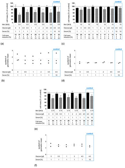 Effect of short-term pre-infection starvation (24 h) on MeV-mediated oncolysis in HT-29 (a,b), HCT-15 (c,d) and HCT-116 (e,f) cells. Short-term starvation and MeV infection of neoplastic HT-29, HCT-15, and HCT-116 cells (human colon carcinoma) were performed according to Figure 1a. At 96 hpi, the remaining tumor cell masses were determined by SRB assay. (a,c,e) Black bars represent MOCK-infected tumor cells (addition of Opti-MEM only, no infectious virus particles); checkered bars display tumor cells infected with MeV. Means and SEM of three or two independent experiments are shown; control: tumor cell cultures and infections performed under standard medium conditions (no starvation). (b,d,f) The impact of starvation on the virus-mediated oncolysis efficacy was evaluated by comparing the ratios of uninfected (MOCK) and virus-infected groups (VIRUS) between starving and standard medium conditions (control). Statistical analysis was performed using the Dunnett’s multiple comparison test. Each dot represents one run of the experiment; horizontal lines represent means of quotient of geometric mean (QoGM).