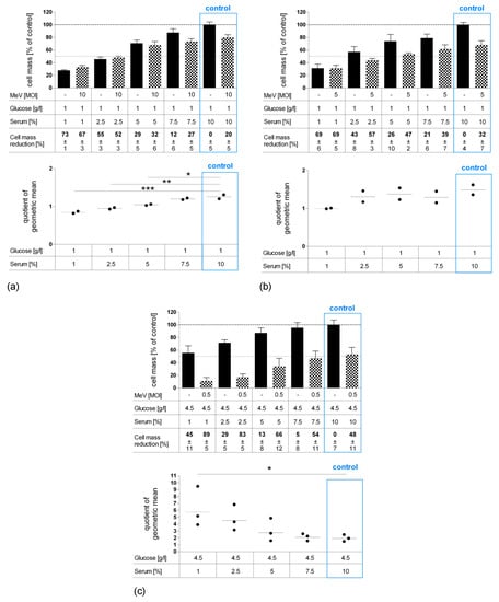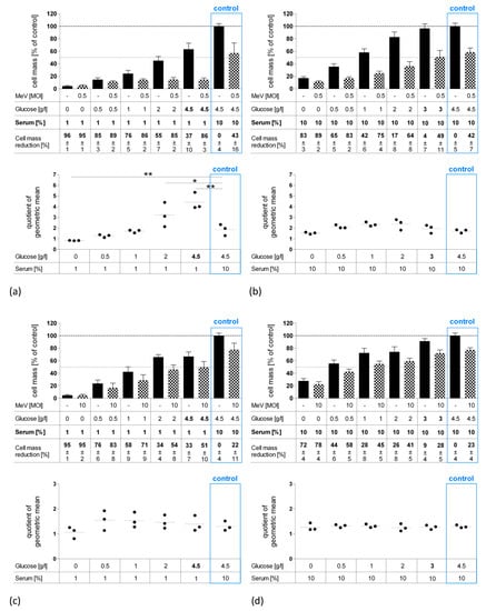For HT-29 cells, the virus-mediated cell-killing rate under standard conditions correlates to the extent of low-glucose, standard serum conditions (Figure 4b). Notably, MeV-mediated oncolysis rate doubled under low-glucose, low-serum starvation (4.5 g Glc/L, 1% FCS and 2 g Glc/L, 1% FCS), compared to control (Figure 4a). These findings were confirmed when looking at our parameter QoGM indicating virotherapy efficacy: “QoGM” increased significantly for HT-29 cells when long-term starvation conditions were applied (at 4.5 g and 2 g Glc/L, 1% FCS compared to control). The decrease of QoGM at 0 g Glc/L, 1% FCS can be attributed to the very low amount of remaining cell mass, where no significant differences between infected and uninfected groups could be measured. In summary, low-glucose, low-serum starvation has the potential to enhance MeV-mediated oncolysis efficacy in HT-29 CRC cells, in terms of a synergistic effect.