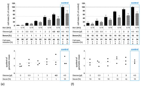 As shown by bar graphs, long-term “starvation only” (no infection) dramatically reduced tumor cell masses of all cell lines (black bars). Combining starvation with MeV-GFP treatment (checkered bars) resulted in measles virus-induced cell killing that was still effective: For HCT-15 cells, treatment with MeV-GFP led to a cell mass reduction of ~22% under standard medium conditions (control) and to a proportional extent either during low-glucose, low-serum (Figure 4c), or low-glucose, standard serum starvation conditions (Figure 4d). The same applies to HCT-116 cells, where a 35% cell mass reduction under control conditions was similarly observed under starvation conditions (Figure 4e). Exceptions apply to the low concentration ranges, especially in low-glucose, low-serum starvation, where remnant cell masses were nearly zero, and therefore no remarkable difference between “starved only” and “starved plus virotherapy” groups could be measured.