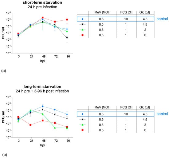 Viral replication under short-term (a) or long-term low-serum (b) starvation in HT-29 cells. After seeding on day 0, HT-29 cells underwent starvation either for 24 h pre-infection ((a): short-term starvation; Figure 1a) or for both 24 h pre- and 3–96 h post-infection ((b): long-term starvation; Figure 1b). Infection with MeV (MOI 0.5) was performed on day 2. Supernatants and tumor cell lysates were harvested at 3, 24, 48, 72, and 96 hpi. Titrations were performed on Vero cells and calculated as total amount of plaque-forming units (PFU)/mL (comprising PFU in supernatants plus cell lysates); control: tumor cell cultures and infections performed under standard medium conditions (no starvation). Means and SD of three independent experiments are shown.