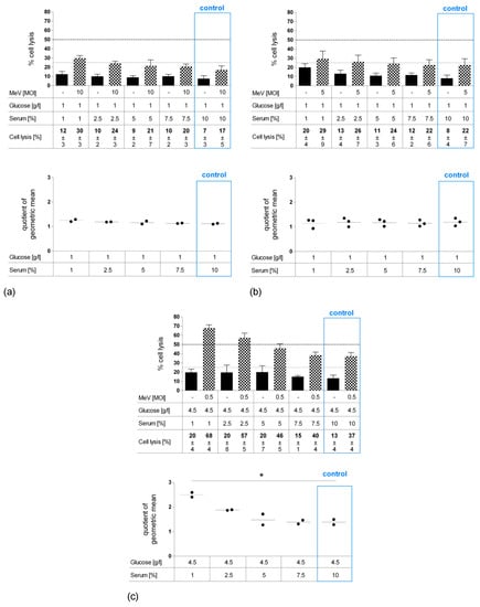 To distinguish whether cell mass reduction was caused by (i) inhibition of cell proliferation or (ii) direct cell lysis, LDH release was quantified as a marker of direct cell lysis (Figure 7a–c). Values of “starvation only”-induced cell lysis (black bars) were at a modest level and only rose slightly with increasing starvation intensity at a range of 7%–12% for CCD-18 Co (Figure 7a), 8%–20% for CCD-841 CoN cells (Figure 7b), and 13%–20% for HT-29 (Figure 7c). By contrast, infection of HT-29 cells with MeV-GFP (MOI 0.5) under serum restriction (checkered bars) approximately doubled the lysis rate compared to standard conditions (37%–68%). For CCD-18 Co and CCD-841 CoN cells, only a moderate increase was found after MeV-GFP infection. Taken together, our QoGM parameter for virotherapy efficacy showed an increase of cell lysis efficacy for HT-29 cells (p = 0.010), whereas QoGM remained unchanged for non-malignant CCD-18 Co and CCD-841 CoN cells.