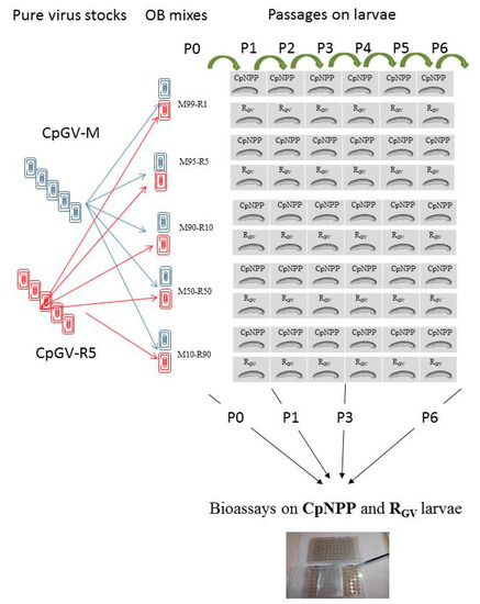 Bioassays of the 10 virus lineages (5 different frequencies × 2 hosts) have been performed both on CpNPP and RGV on OBs at passages P1, P3, and P6. The bioassays of the original mixes (P0) both on susceptible and resistant larvae have been previously published [30]. They are used here as a reference.