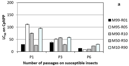 Surprisingly, there was an overall reduction in the efficacy against CpNPP between P0CpNPP and P1CpNPP (from an average LC50 of 15.66 OB/µL–67.52 OB/µL, respectively). This decrease was statistically significant for all but the M99 + 1R P1CpNPP, and this can be explained by the higher frequency of infections with only one genotype under this condition.