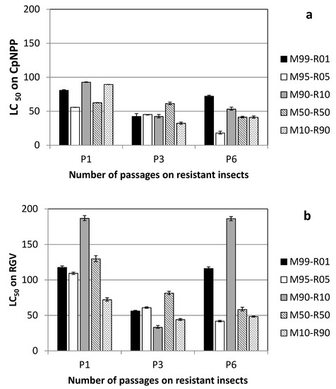 Efficiency (LC50) of the different experimental virus populations replicated on RGV and tested on (a) CpNPP and (b) RGV. Parental CpGV-M and CpGV-R5 alone had LC50s on RGV of 2.22 × 106 OB/µL and 22.43 OB/µL, respectively.