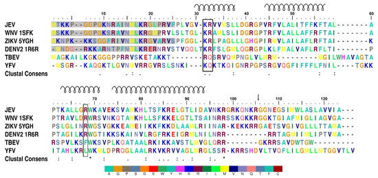 Multiple sequence alignment of flavivirus capsid proteins. Positively charged residues, arginine (R) and lysine (K), accumulate at the N- and C-termini. Lysine 31, arginine 32, and arginine 68 are highlighted with a black box. The spiral above the sequence indicates the α-helical secondary structure and numbering, which is based on the JEV capsid protein. Residues that are not visible in protein structures are shaded in grey. The black arrow marks the natural NS3 protease cleavage site. An asterisk indicates a fully conserved residue. A colon indicates conservation between groups of strongly similar properties. A period indicates conservation between groups of weakly similar properties. The alignment was produced with MUSCLE [40]. Color is given to each residue with the legend below.