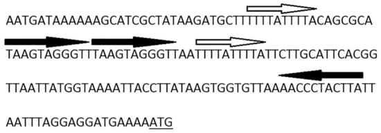 It is not so typical for replication initiator genes to be transcribed in the same orientation with site-specific recombinase genes in temperate phages [] usually relying on host replication machineries in the prophage state, so we have assumed that B83 can use its own RepA-like initiator to replicate extrachromosomally during the lysogenic cycle, as it was described for some other phages, e.g., Escherichia phage P1 []. The presence of ORF32 with a high amino acid sequence similarity to bacterial plasmid protein ParM is known to be required for successful plasmid segregation [], and also suggests that B83 may exist as a circular plasmid in host cytoplasm. ParM is an actin-like motor protein of the ParMRC segregation system, which forms long filaments pushing plasmids to opposite poles of the cell to prevent their loss during cell division []. The ParMRC system has other two components: a centromere-like iterons-containing DNA region parC and a small DNA-binding protein ParR transcribed immediately downstream the parM gene, which serves as an adaptor between ParM and parC []. Interestingly, the product of B83 ORF31 exhibits no homology to ParR, but contains the predicted N-terminal ribbon–helix–helix fold similar to that of the members of the MetJ/Arc-superfamily of DNA-binding proteins and ParG. ParG is an adaptor protein of another plasmid segregation system, and it functions generally similar to ParR, binding DNA in the iterons-containing region [,]. We have identified iterons within the 165-bp region preceding ORF32, which may be the binding site for the ParG-like adaptor protein (Figure 3), so in this case, B83 seems to have all of the three essential elements of a plasmid segregation system.