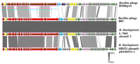 B83, BMBtp14, and pBTHD521-2 have highly similar whole-genome organization (Figure 4), with the most of the genes encoded on one strand and 18% to 23% of the genes encoded on the opposite strand. The latter includes the genes that are known to play a role in plasmid replication, such as XerC/XerD site-specific recombinases and ParM-like protein involved in plasmid multimer resolving and partitioning [,,]. The presence of the plasmid segregation proteins is characteristics of phages that were described as forming circular autonomously replicating plasmid prophages, such as Bacillus phages TP-21 [], SU-11 [], and IEBH [], as well as Bp8p-C and Bp8p-T, for which the effect of ParM-like protein on lysogeny was experimentally confirmed []. This may indicate that B83, BMBtp14, and pBTHD521-2 are able to form circular plasmid prophages instead of integration into the host chromosome. When sequencing total bacterial DNA, such extrachromosomal prophages form circular contigs that can be mistaken for plasmids, but the presence of all the typical clusters of phage genes, such as morphogenesis, DNA packaging, and lysis genes, can reliably indicate the nature of the circular molecules. In this work, it was shown that B83 can exist as the circular plasmid in the cytoplasm of the host strain B. thuringiensis VKM B-83 (Figure S2). However, more detailed studies are needed for clear understanding of the lysogenic states of B83 and related phages.