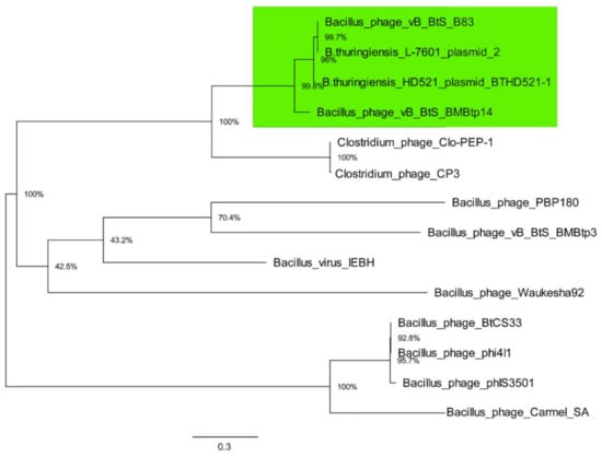 Then, the phylogenetic analysis of TerL amino acid sequences from the same 14 genomes with maximum likelihood was performed, which is a standard phage phylogenetic comparison method. The resultant tree (Figure 6) shows that TerL proteins from B83, BMBtp14, plasmid pBTHD521-2, and plasmid unnamed 2 form a clade, which is consistent with the pan-genomic tree (Figure 5), indicating that these phages represent a distinct branch of viruses. As long as two members of this clade were mistaken for plasmids, we propose to create a new Siphoviridae genus including only Bacillus phages BMBtp14 and B83, which we have tentatively named “Bembunaquatrovirus” based on the first sequenced member (BMBtp14). On average, the genomes of members of this genus are 50.4 kb with a GC-content of 36.3%, 73 ORFs, and no tRNA genes. They have a relatively low whole-genome nucleotide identity (BLASTN) of approximately 37%, but a high level of genomic collinearity and share 35 proteins, as determined with CoreGenes3.5, which is from 46.7% to 49.3% and exceeds a threshold of >40%, which was previously used for the definition of phage genera [,,].