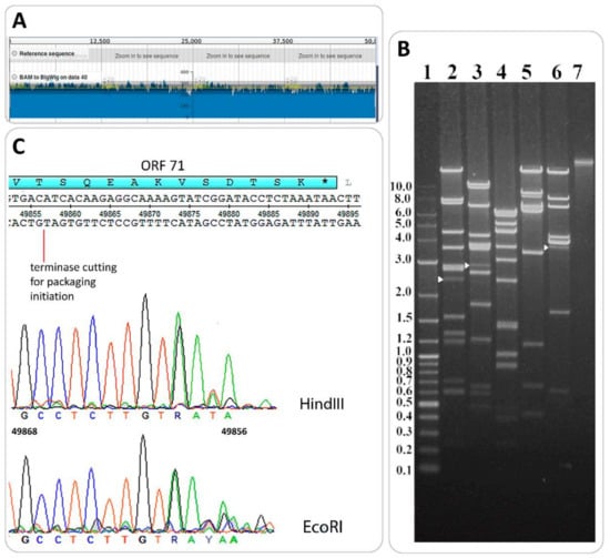 The direct experimental validation of headful packaging was performed by the restriction digest of B83 DNA with restriction endonucleases HindIII, EcoRI, NsiI, XbaI, and BsrGI. In the cases of enzymes HindIII, EcoRI, and BsrGI, we were able to see submolar fragments (pac-fragments) with the lengths of 2.5 kb, 2.9 kb, and 3.5 kb, respectively, appearing on the tracks in addition to all the predicted restriction fragments (Figure 7B). This type of restriction pattern is considered to be diagnostic of headful packaging []. The DNA of pac-fragments was extracted from electrophoresis gel and used for Sanger sequencing with primer 5’-TGTTAATAGGAGCGCTCTCT-3’, annealing 200 bp downstream the first codon of the small terminase subunit gene, given the conserved location of the pac-site within or near this gene in headful packaging phage genomes []. For HindIII-generated and EcoRI-generated pac-fragments, we were able to obtain high-quality reads mapping a terminase-generated cut approximately in position 49857 of the genome, within ORF71, as is shown in sequencing chromatograms (Figure 7C). Thus, B83 apparently uses the headful mechanism of DNA packaging with accurate site-specific initiation.