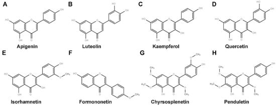 Chemical structures of (A) Apigenin (B) Luteolin (C) Kaempferol (D) Quercetin (E) Isorhamnetin (F) Formononetin (G) Chrysosplenetin and (H) Penduletin.