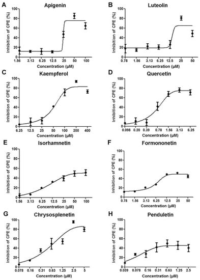 Effects of (A) Apigenin (B) Luteolin (C) Kaempferol (D) Quercetin (E) Isorhamnetin (F) Formononetin (G) Chrysosplenetin and (H) Penduletin on EV71-induced CPE. 293S cells were infected with WT-EV71 (MOI = 0.04) and simultaneously treated with serially diluted flavonoids. After incubation for 48 h, cell viabilities were measured to calculate the inhibitory percentages of EV71-induced CPE. N = 3 replicates in each concentration.