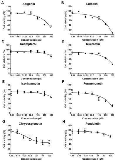 Cytotoxicity of (A) Apigenin (B) Luteolin (C) Kaempferol (D) Quercetin (E) Isorhamnetin (F) Formononetin (G) Chrysosplenetin and (H) Penduletin on 293S cells. 293S cells were treated with serially diluted flavonoids for 48 h, after which the cell viabilities were measured and compared to that of the cell control. N = 3 replicates in each concentration.