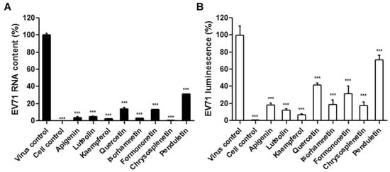 Effects of the flavonoids on EV71 RNA replication (A) and protein (B) synthesis. (A) 293S cells were infected with WT-EV71 (MOI = 1) in conjunction with the treatment of the flavonoids at optimal concentrations. At 16 h post-infection, EV71 RNA was extracted from the cell cultures and subjected to qRT-PCR. (B) 293S cells were infected with EV71-luc (200 CCID50) in conjunction with the treatment of the flavonoids at optimal concentrations. At 16 h post-infection, EV71 protein synthesis was monitored via measurement of the luminescence intensity. N = 3 replicates for each compound. A one-way ANOVA test was performed to compare the differences between test groups and the virus control with the statistical significance denoted by asterisks, *** p < 0.001.